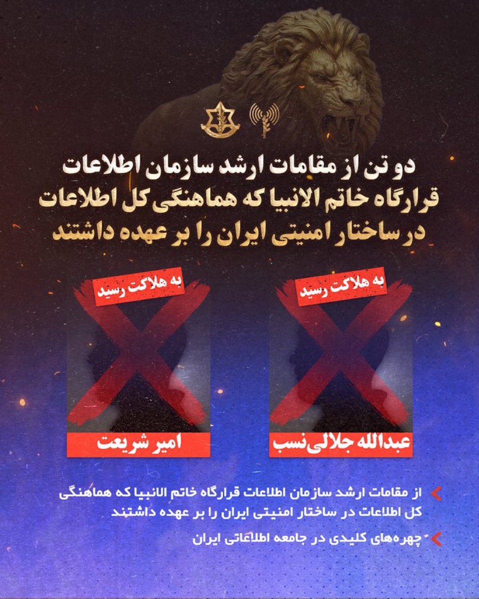 ⭕️ Following the elimination of Saleh Asadi, the deputy intelligence chief, in the opening strike of Operation "Roar of Lions," Jalalinasab and Shariat had been appointed as his successors. The two were considered high-ranking intelligence commanders and key figures in Iran's intelligence community.