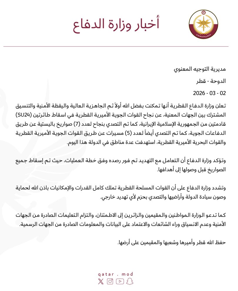 Qatar's Ministry of Defense announced that the Qatar Emiri Air Force successfully shot down two Iranian Su-24 military aircraft and intercepted seven ballistic missiles, while Qatar Air and Navy forces intercepted an additional five drones that targeted multiple areas within the state. The ministry stated that all threats were neutralized immediately upon detection, with all missiles destroyed before reaching their targets. Qatar's MoD emphasized the armed forces possess full capabilities to defend the country's sovereignty and respond firmly to any external threat. Citizens, residents, and visitors were urged to remain calm and rely solely on information from official channels.